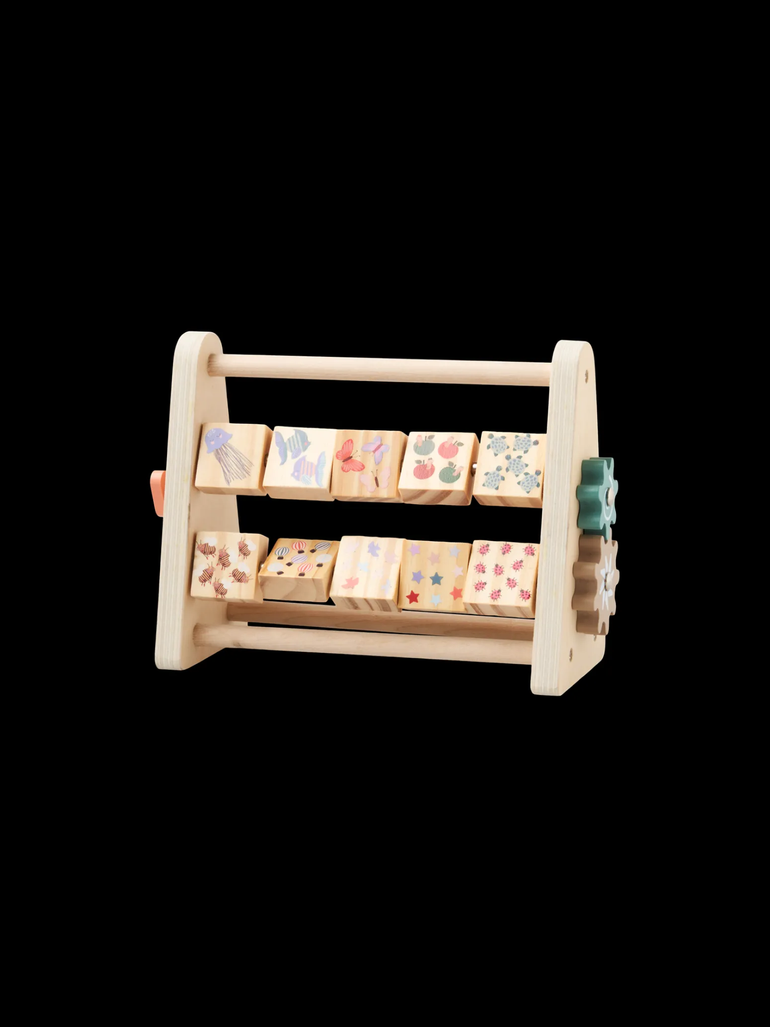 Der Abakus der Schwestern mit hölzernen Zahlenblöcken ist 100% FSC®-zertifiziert. Er misst 19 x 9,5 x 16,5 cm. Der Abakus hat die Zahlen 1-9 auf der einen Seite der Blöcke und süße Muster, die mit den Zahlen auf der anderen Seite korrespondieren.