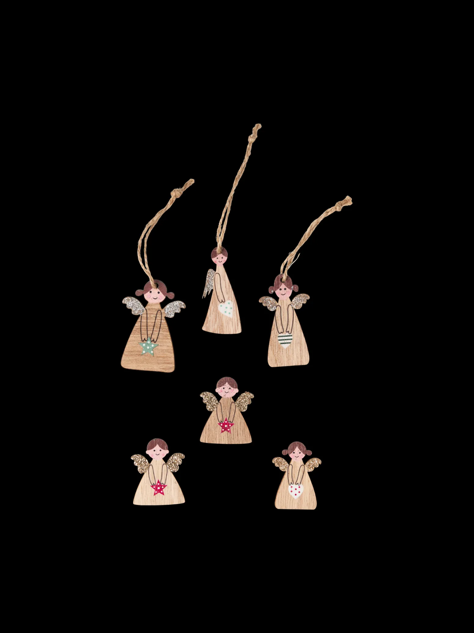 Die dekorativen Engel der Schwestern sind aus FSC®-zertifiziertem Pappelholz gefertigt. Das Set enthält 3 Engel mit einer 5,5 cm langen Juteschnur und 3 Engel mit einem Aufkleber auf der Rückseite in einer Höhe von 4 cm.