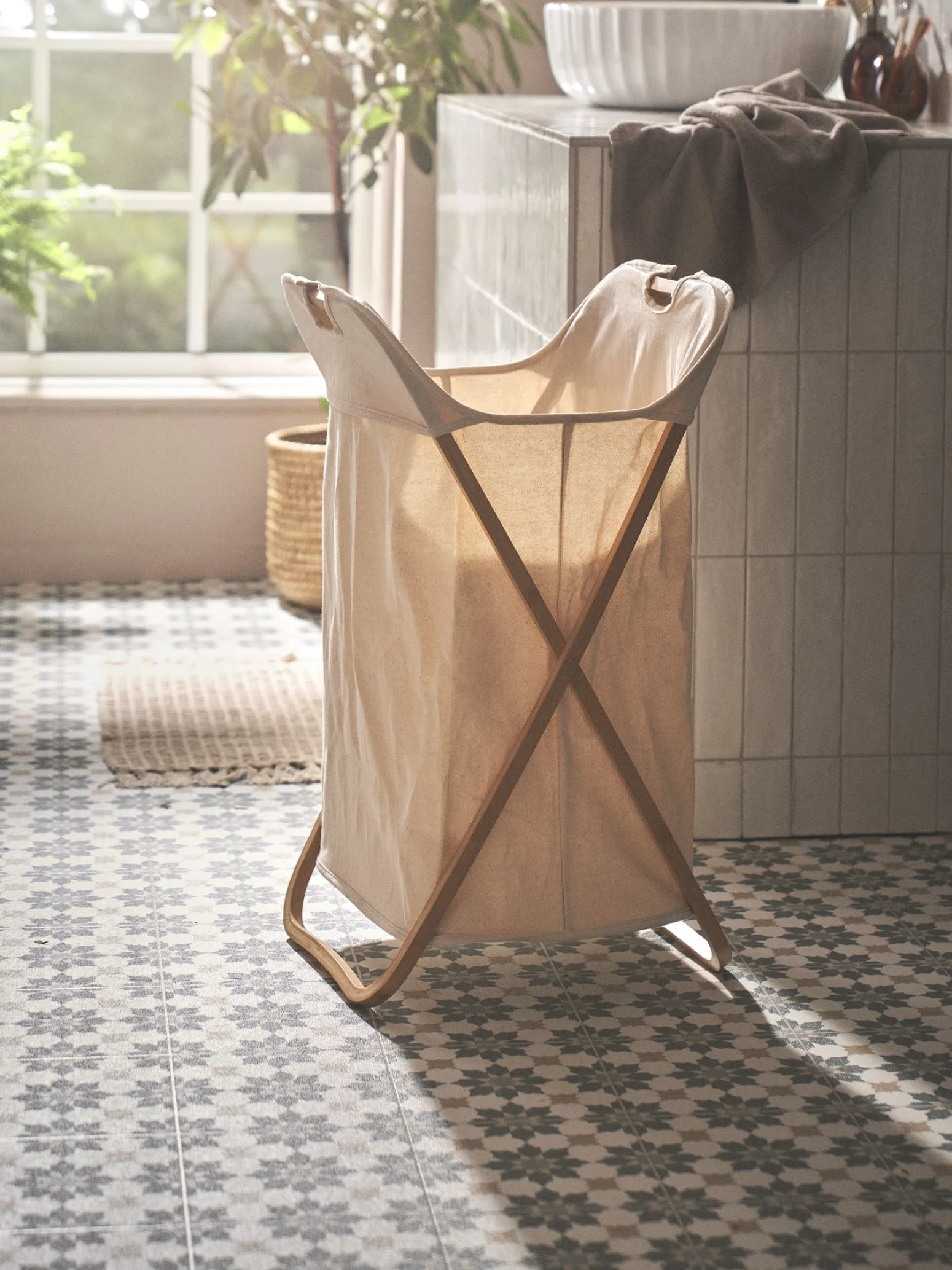 Der Wäschekorb der Schwestern besteht aus FSC®-zertifiziertem Bambus und ist mit Stoff gefüttert.