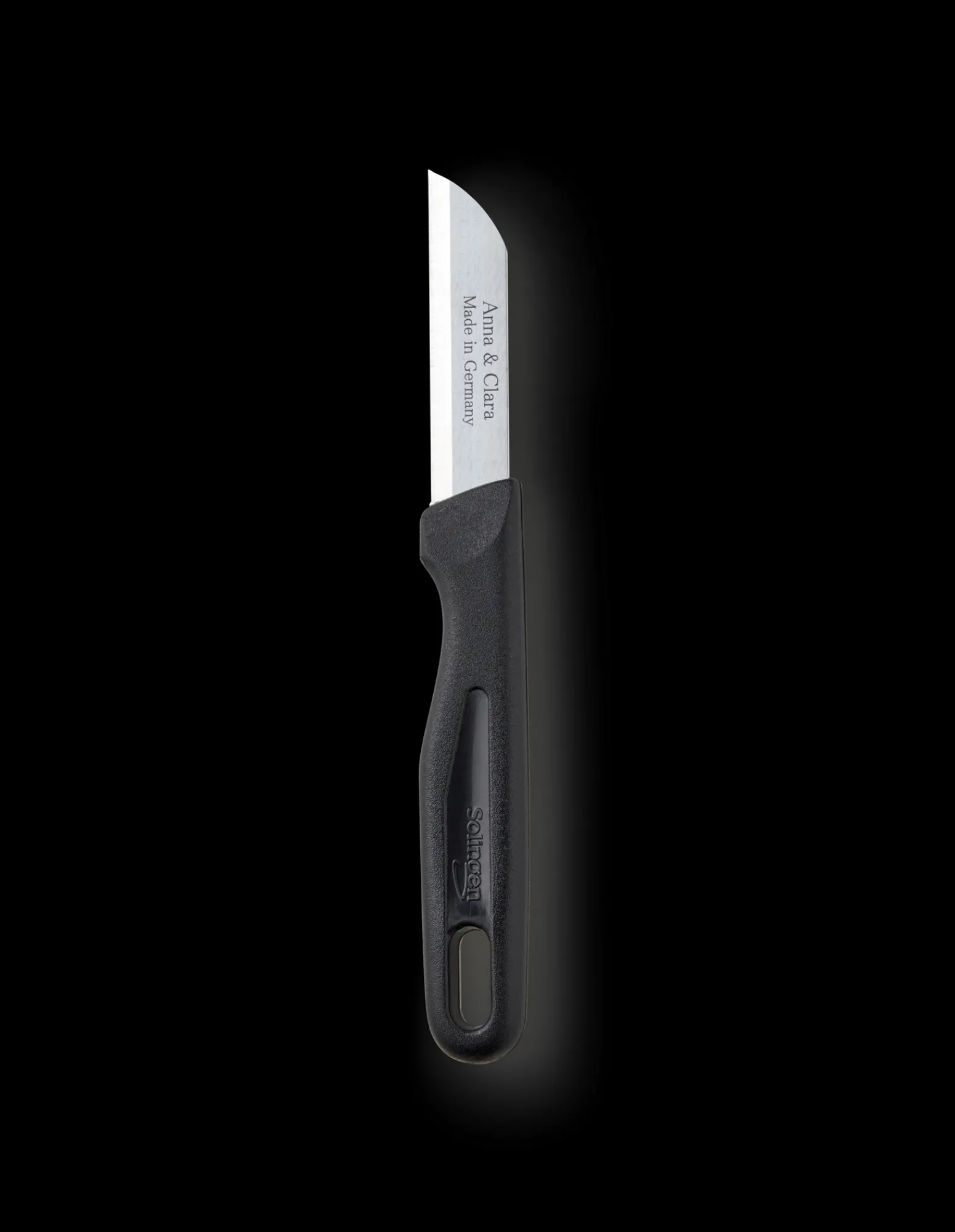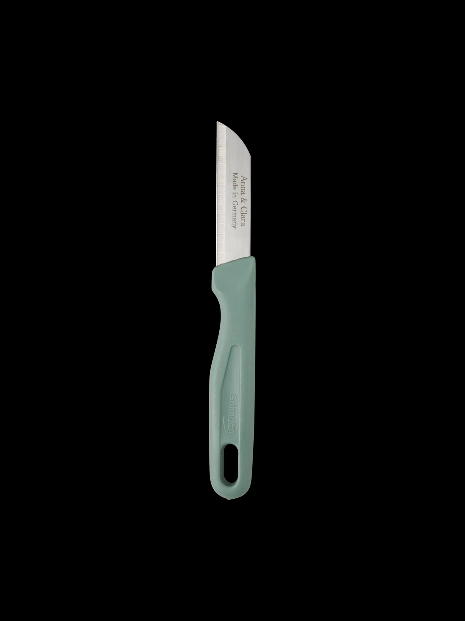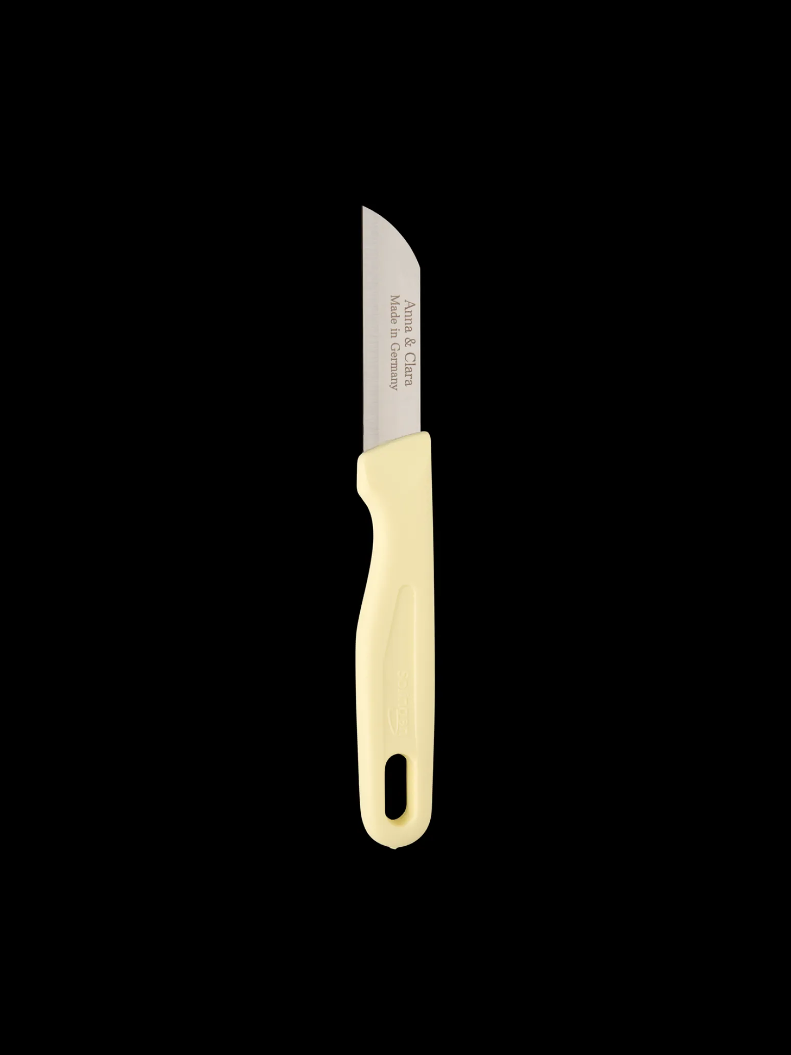 Anna und Claras Schälmesser misst 16 cm in der Länge und 2 cm in der Breite. Es wird in Deutschland aus Kunststoff und rostfreiem Stahl hergestellt.