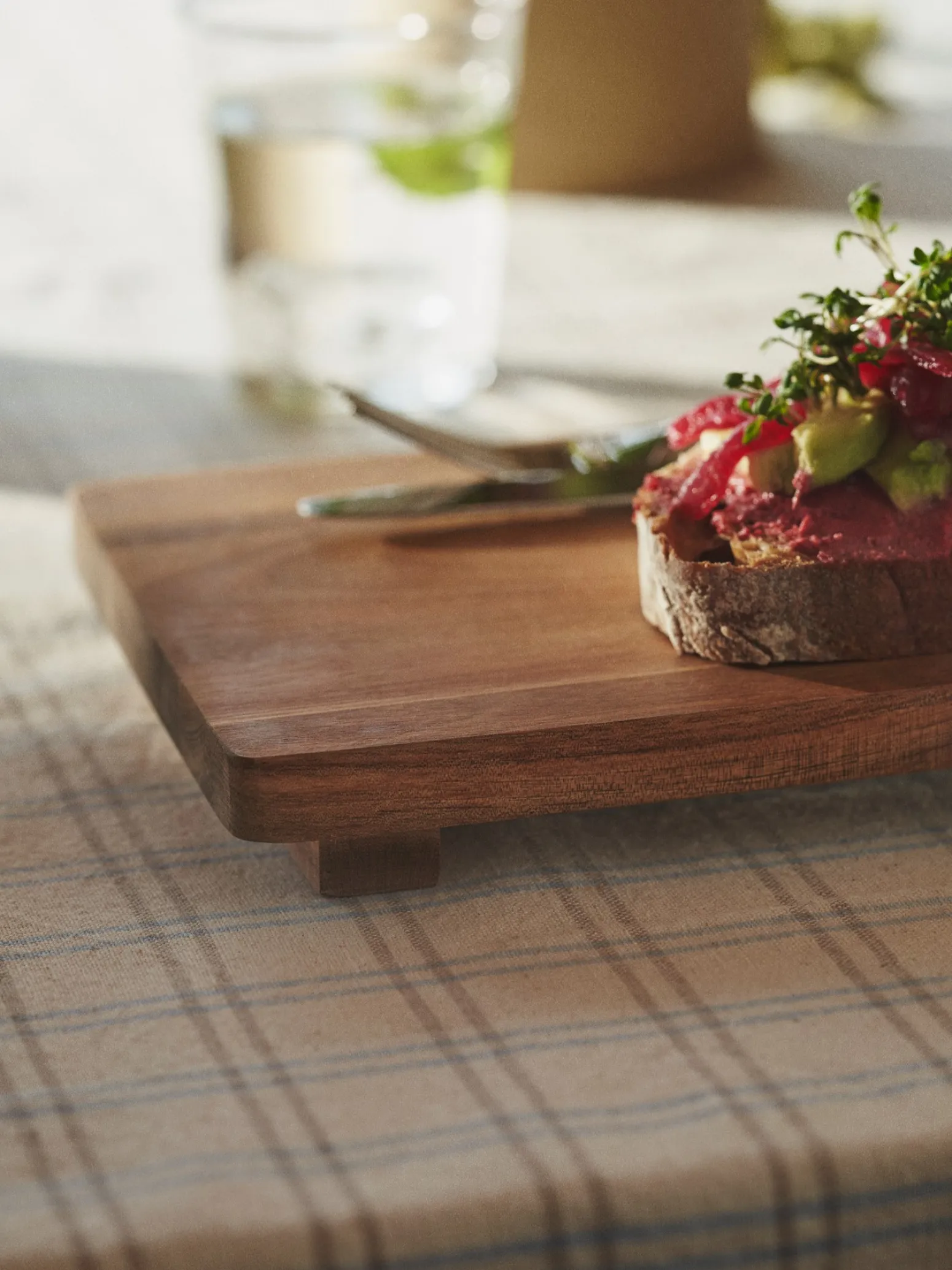 Das Schneidebrett der Schwestern besteht aus FSC®-zertifiziertem Akazienholz und misst 30 x 16 x 3 cm.Da es auf Füßen steht, ist es leicht erhöht, was es zu einer eleganten Art macht, kleine Gerichte zu servieren und einen Hauch von Eleganz auf den Tisch zu bringen.Da Akazienholz ein natürliches Material ist, weisen die Schwestern darauf hin, dass es in Farbe und Ausdruck variieren kann.