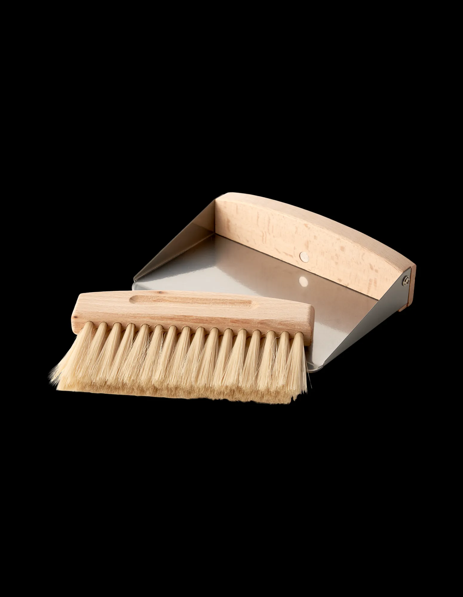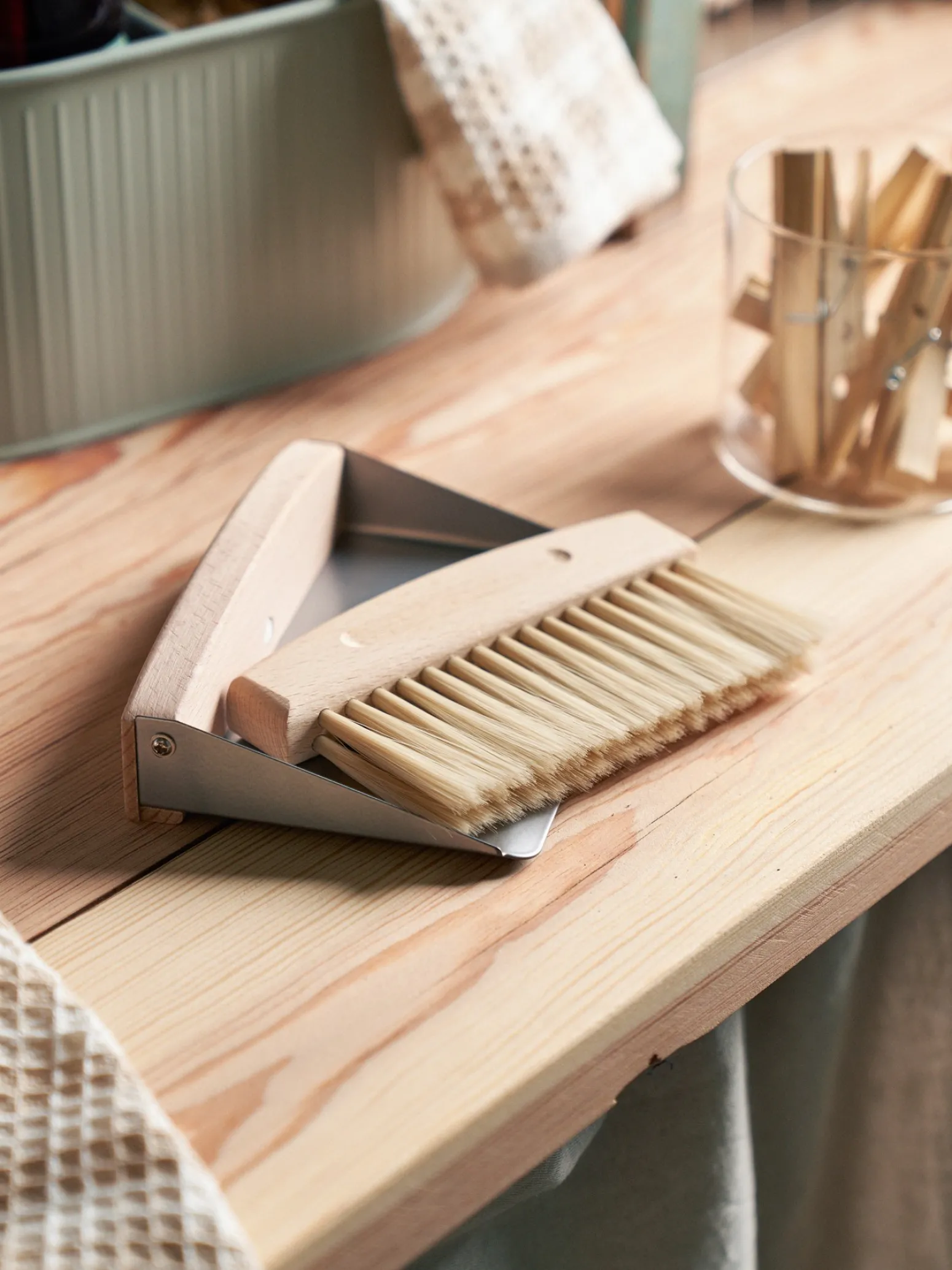 Annas und Claras Tischbesen mit Kehrschaufel ist aus FSC©-zertifiziertem Buchenholz, Metall und Kunststoff gefertigt. Der Besen ist mit Magneten an der Kehrschaufel befestigt.