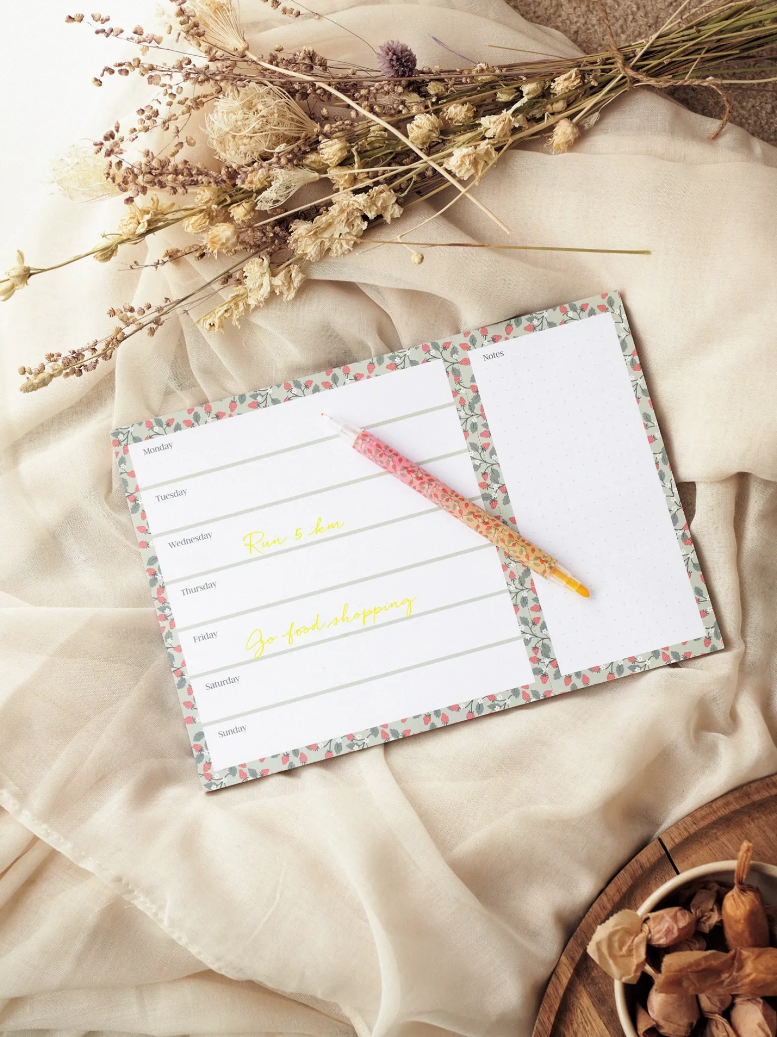 Der Planer ist FSC®-zertifiziert und trägt das Nordic Swan Ecolabel. Er wird in Dänemark hergestellt und enthält 60 Blatt 100 g/m2 Papier. Der Notizteil unter dem Wochenplaner kann dank des perforierten Papiers abgerissen werden – perfekt zum Mitnehmen.
