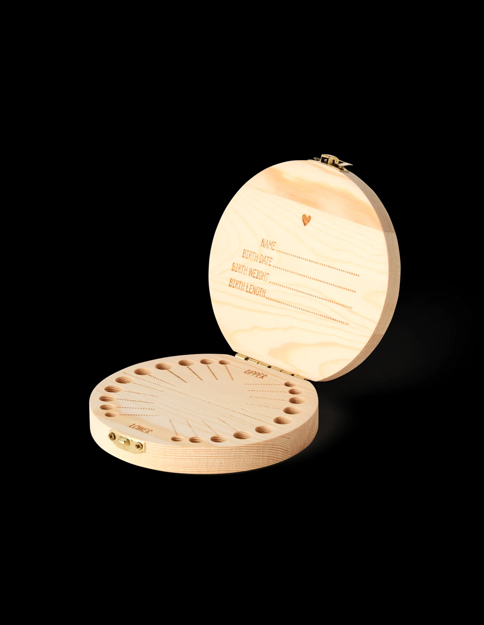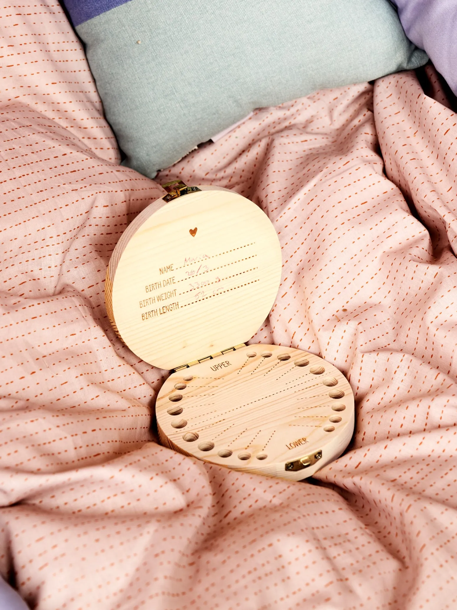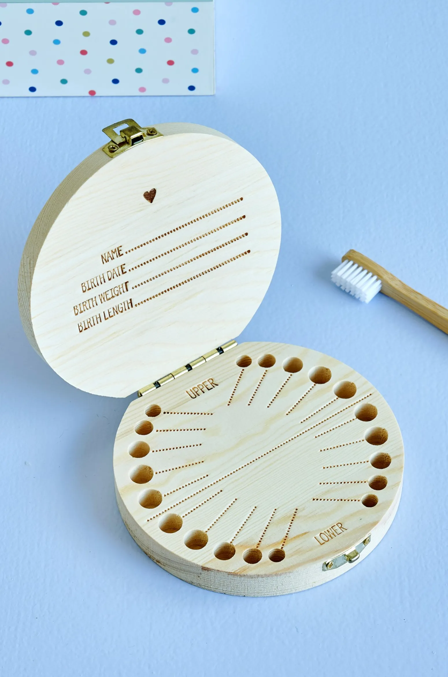 Die Zahndose der Schwestern besteht aus FSC®-zertifiziertem Kiefernholz und misst 12 cm im Durchmesser. Es gibt Platz, um einen Namen, ein Geburtsdatum, ein Geburtsgewicht und eine Geburtslänge in den Deckel zu schreiben, sowie Daten neben jedem einzelnen Zahn.