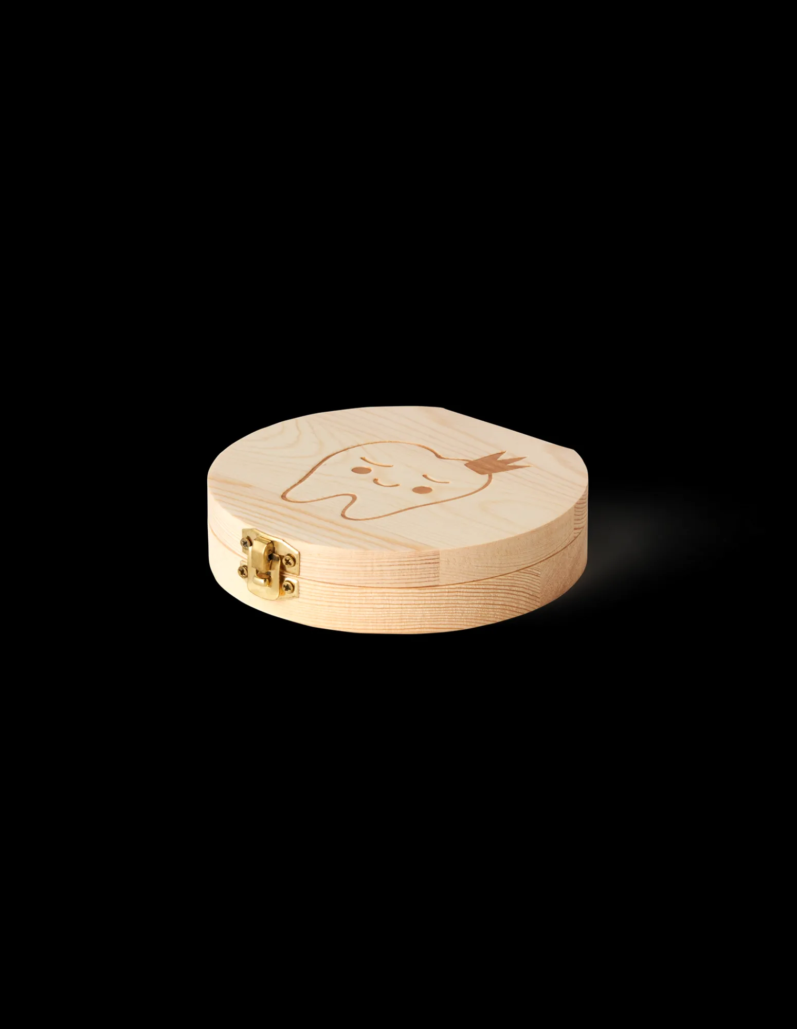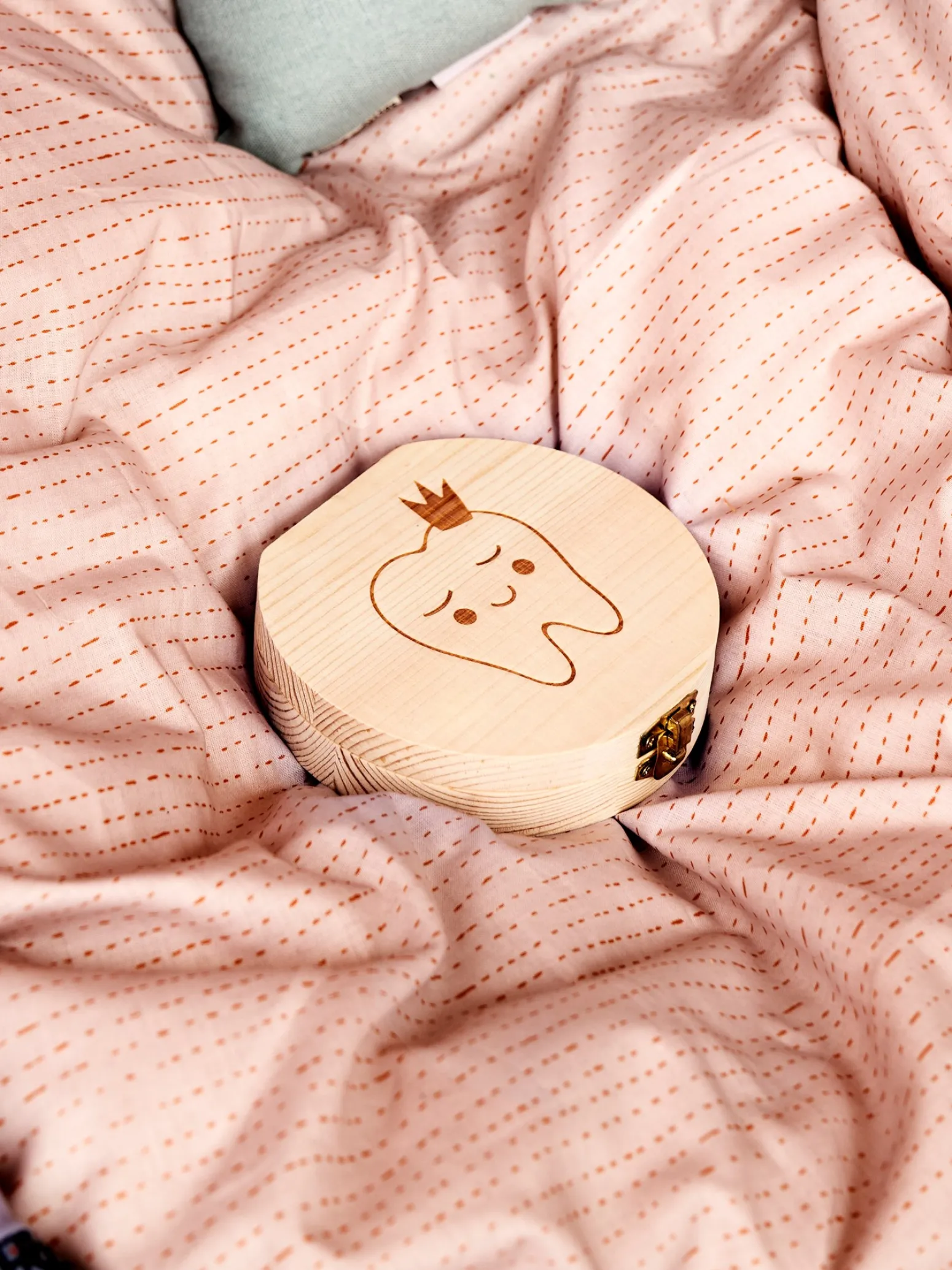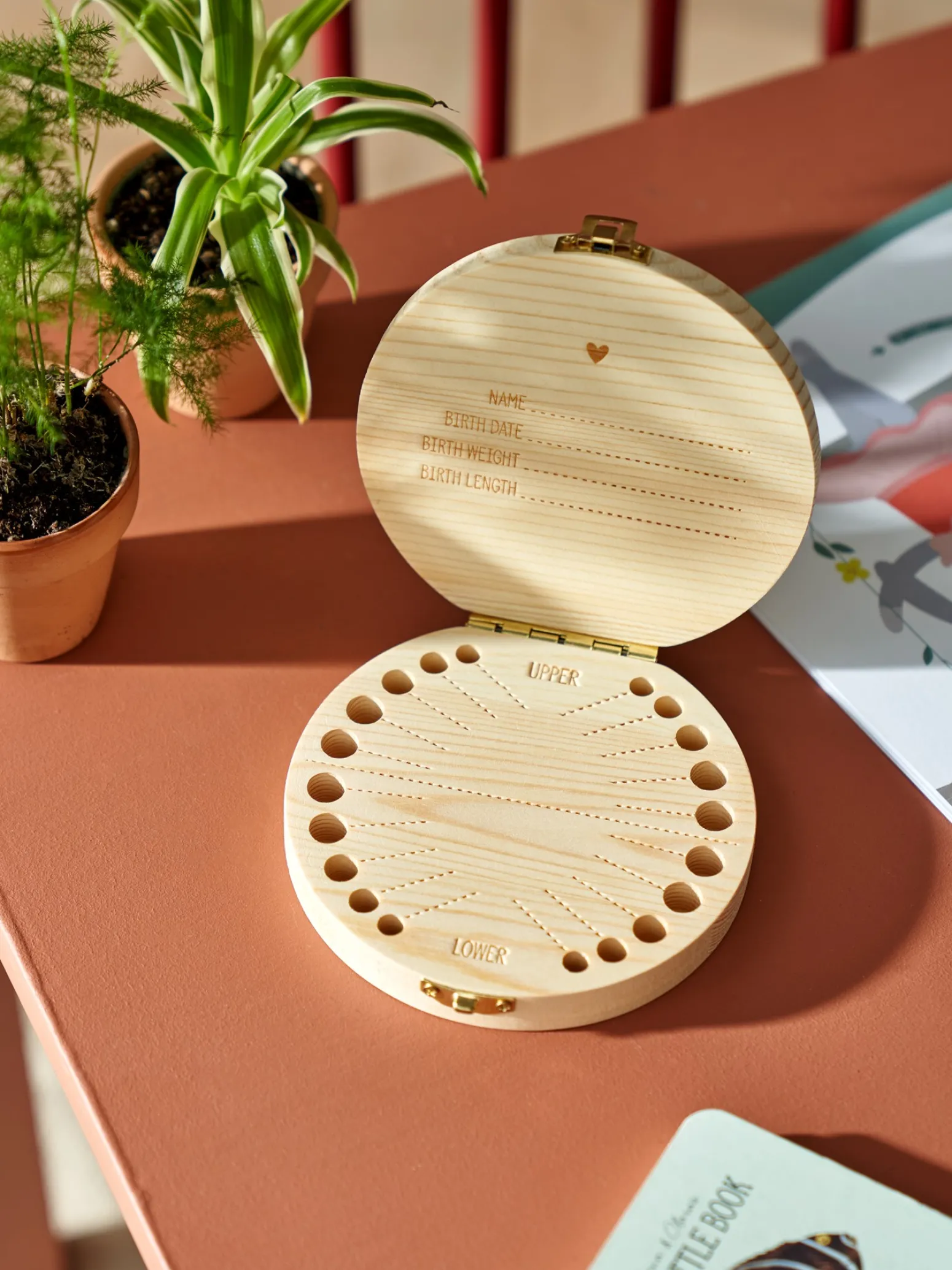 Die Zahndose der Schwestern besteht aus FSC®-zertifiziertem Kiefernholz und misst 12 cm im Durchmesser. Es gibt Platz, um einen Namen, ein Geburtsdatum, ein Geburtsgewicht und eine Geburtslänge in den Deckel zu schreiben, sowie Daten neben jedem einzelnen Zahn.
