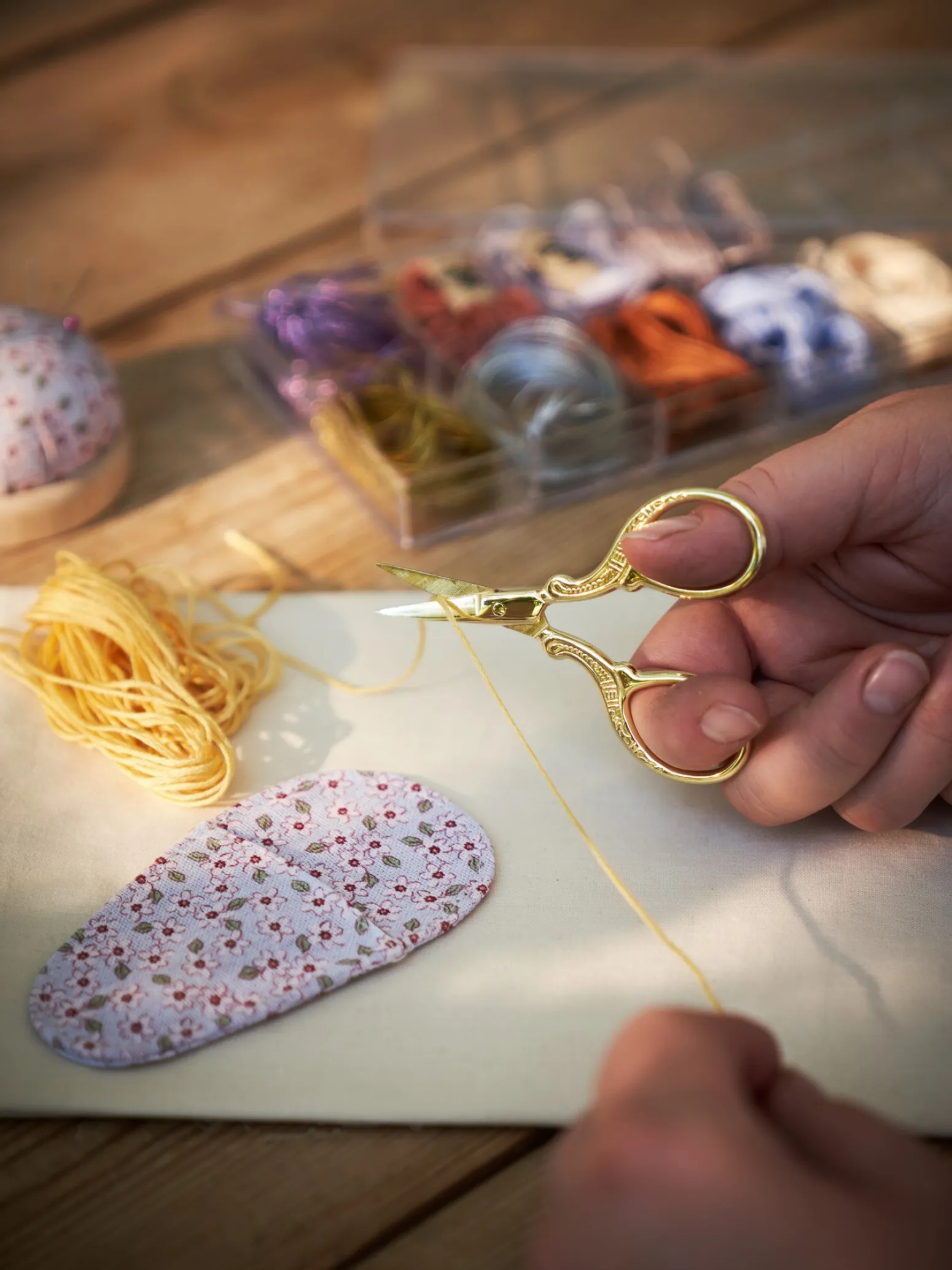 Die Schere der Schwestern hat ein wunderschönes Gold-Finish und wird in einem hübschen Baumwolletui geliefert, um sie leicht auf Reisen mitzunehmen.