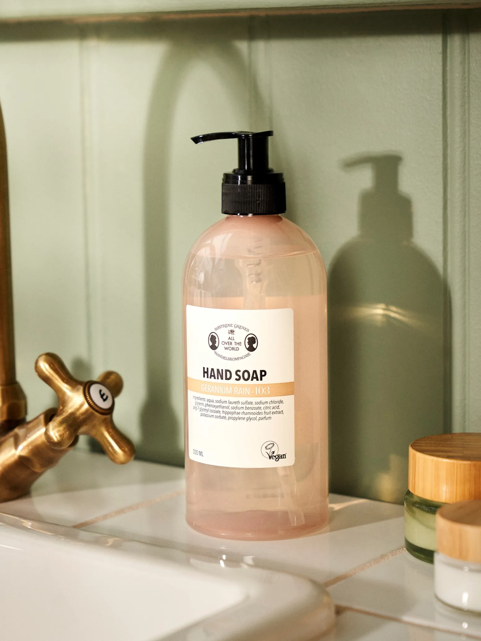 Anna und Clara verwöhnen gerne ihre Haut, was sich unter anderem in ihrer Auswahl an Pflegeprodukte im Badezimmer widerspiegelt. Die Schwestern bevorzugen Produkte in derselben Serie zu kaufen, denn dies schafft ein einheitliches Bild im Badezimmer. Sie kaufen allerdings nicht irgend eine beliebige Serie, sondern haben ganz klare Präferenzen. „Eine Handseife wird mehrmals Täglich verwendet. Daher ist es wichtig, dass Sie eine Handseife finden, die unter anderem auch Feuchtigkeit spendet“, erklärt Clara, während sie ihre Hände in schäumender Handseife reinigt.Die Geranium Rain Handseife erfüllt Anna und Claras Erwartungen bezüglich einer guten Handseife und enthält unter anderem Feuchtigkeitsspendendes Glycerin. Sie können die Geranium Rain Handseife mit gutem Gewissen benutzten, denn die Seife ist sowohl dermatologisch getestet und vegan. „Sie werden den Kauf der Geranium Rain Handseife nicht bereuen“, versichert Anna mit einem Lächeln und lädt Sie ein, alle Produkte der Geranium Rain Serie auszuprobieren, die unter anderem nach Zitrusfrüchten und Jasmin duften.