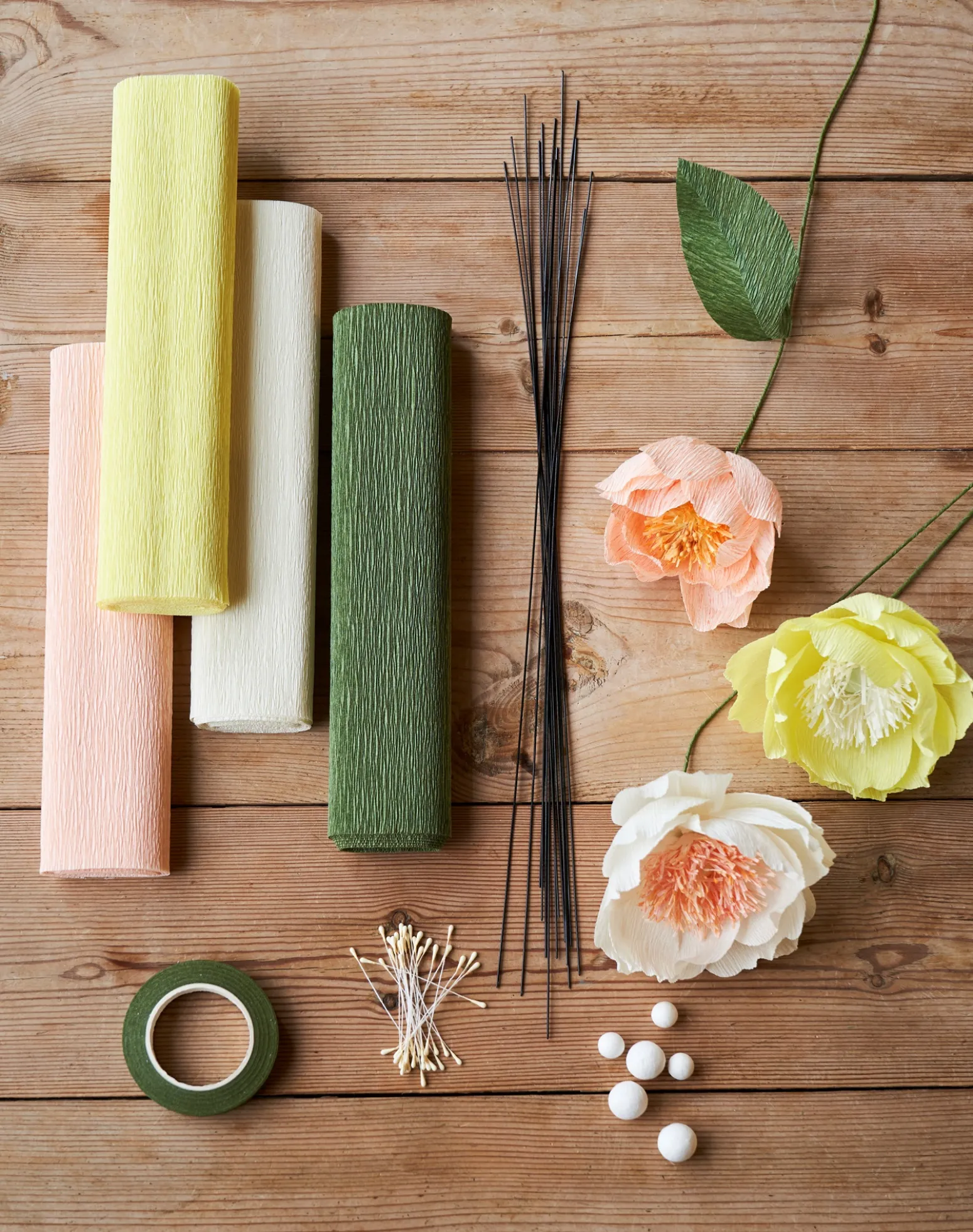 Die Drahtstiele der Schwestern sind die perfekte Basis für Ihre selbstgemachten Papierblumen. Zusammen mit Blumenband, Krepppapier und Staubblättern können Sie eine schöne Blumendekoration für Ihr Zuhause kreieren.