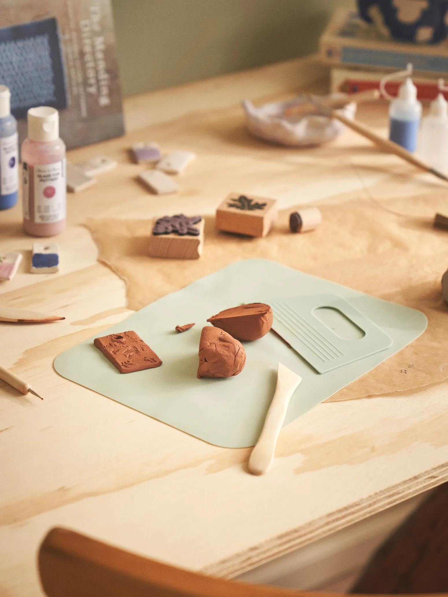 Die Matte und der Schneider der Schwestern erleichtern das Portionieren und Ausrollen von Ton.