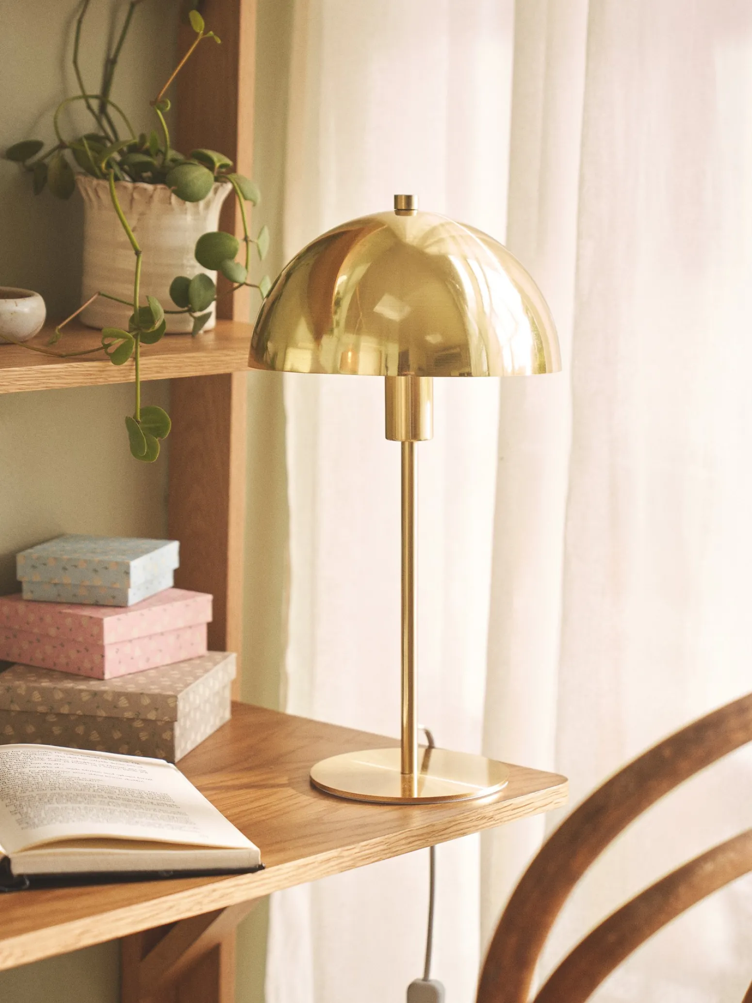 Die Tischlampe der Schwestern hat einen Schirm von Ø20 x 10,5 cm, während der Sockel Ø13 cm misst. Es verfügt über eine E14-Fassung. Das Kabel hat eine Länge von 1,5 m.