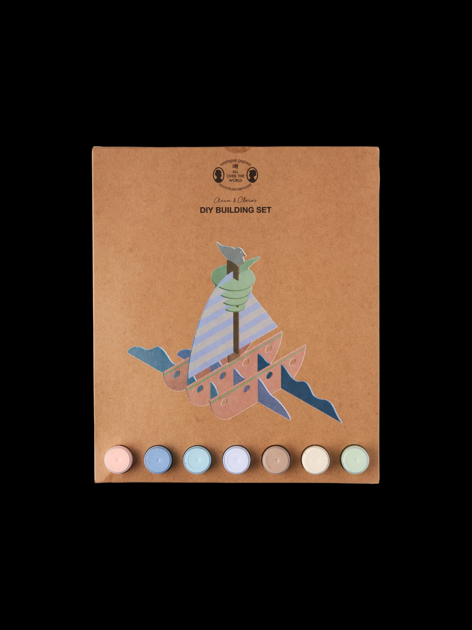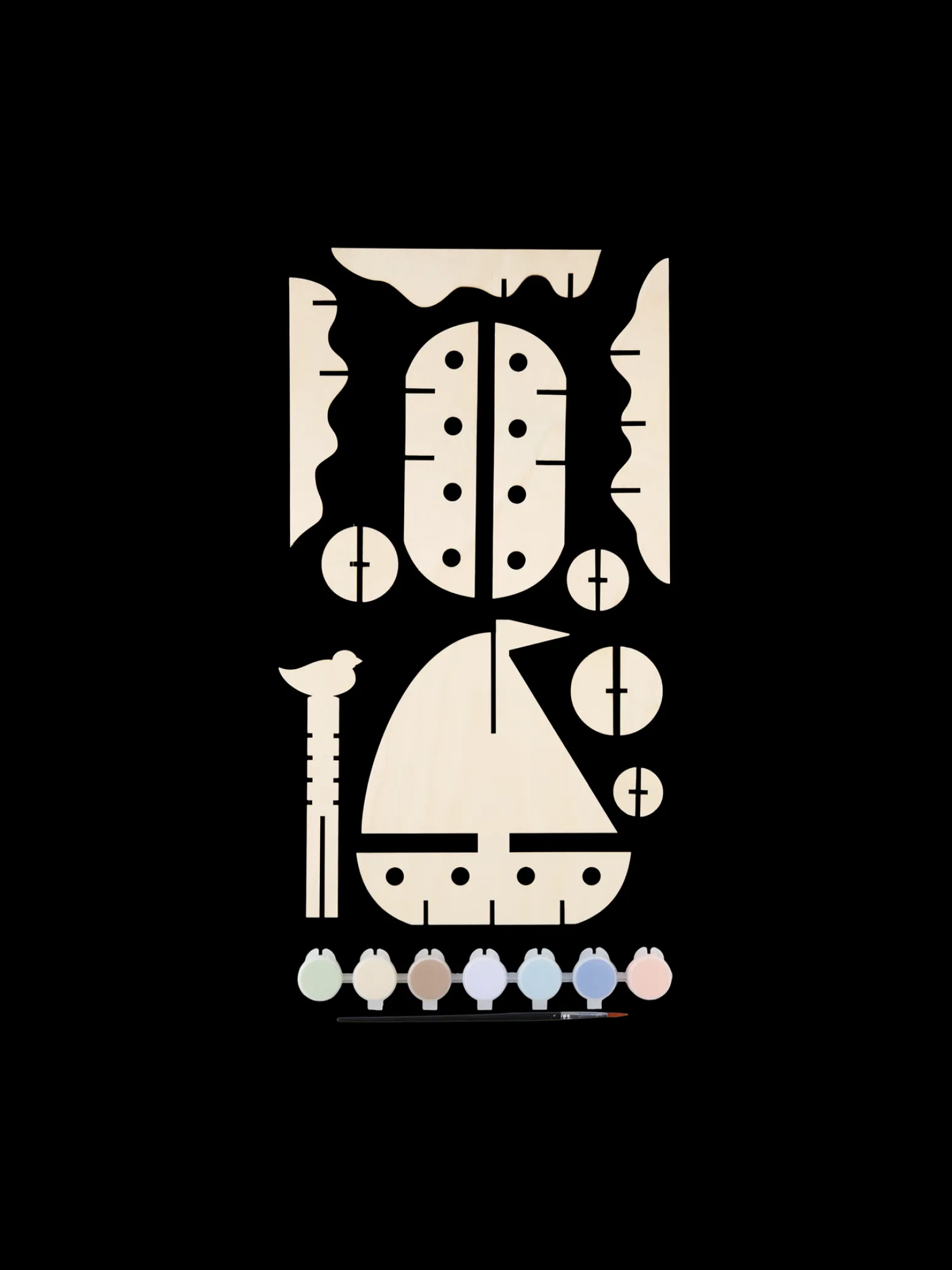 Der DIY-Baukasten aus Holz der Schwestern ist 100 % FSC®-zertifiziert. Das Set enthält Holzplatten mit ausgeschnittenen Formen, um ein schönes Schiff zu bauen, sowie einen Pinsel und 7 Acrylfarben auf Wasserbasis.