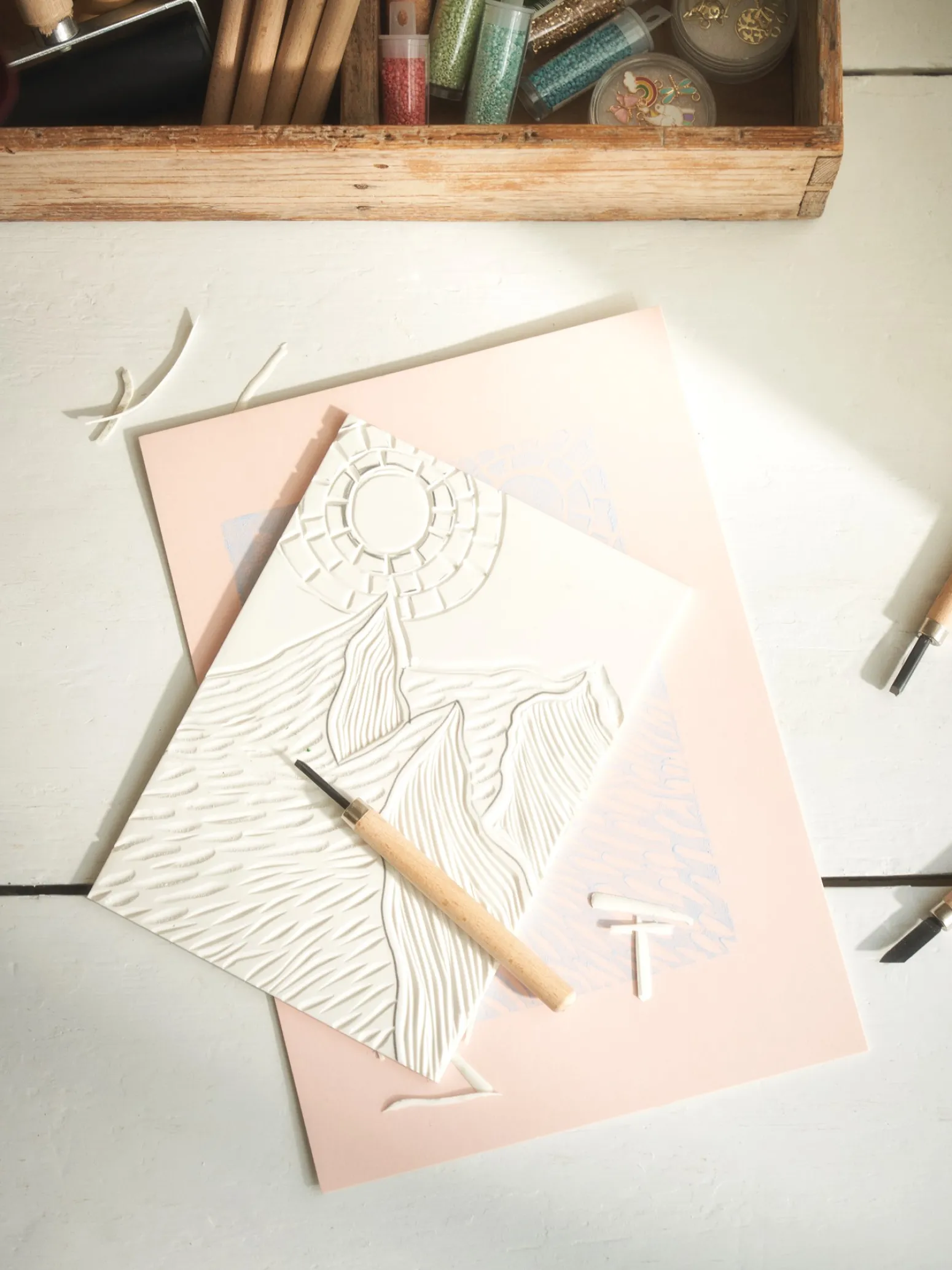 Die Platte für den Linolschnitt besteht aus thermoplastischem Gummi. Sie hat eine Dicke von 0,5 cm und hat ein A5-Format. Verwenden Sie Linolschnitt-Schnitzwerkzeuge, um schöne Muster in die Platte zu schneiden.