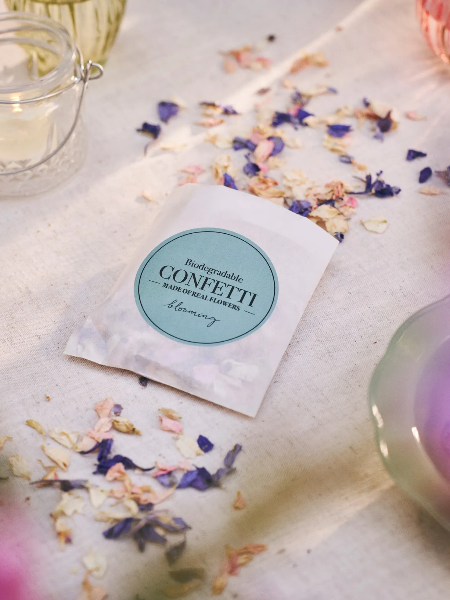 Mit den biologisch abbaubaren Trockenblumen der Schwestern können Sie einen femininen und festlichen Look kreieren, egal ob Sie sie als Konfetti oder zur Dekoration des Tisches verwenden. Das Konfetti ist auch ein toller Ersatz für Reis bei Hochzeiten.