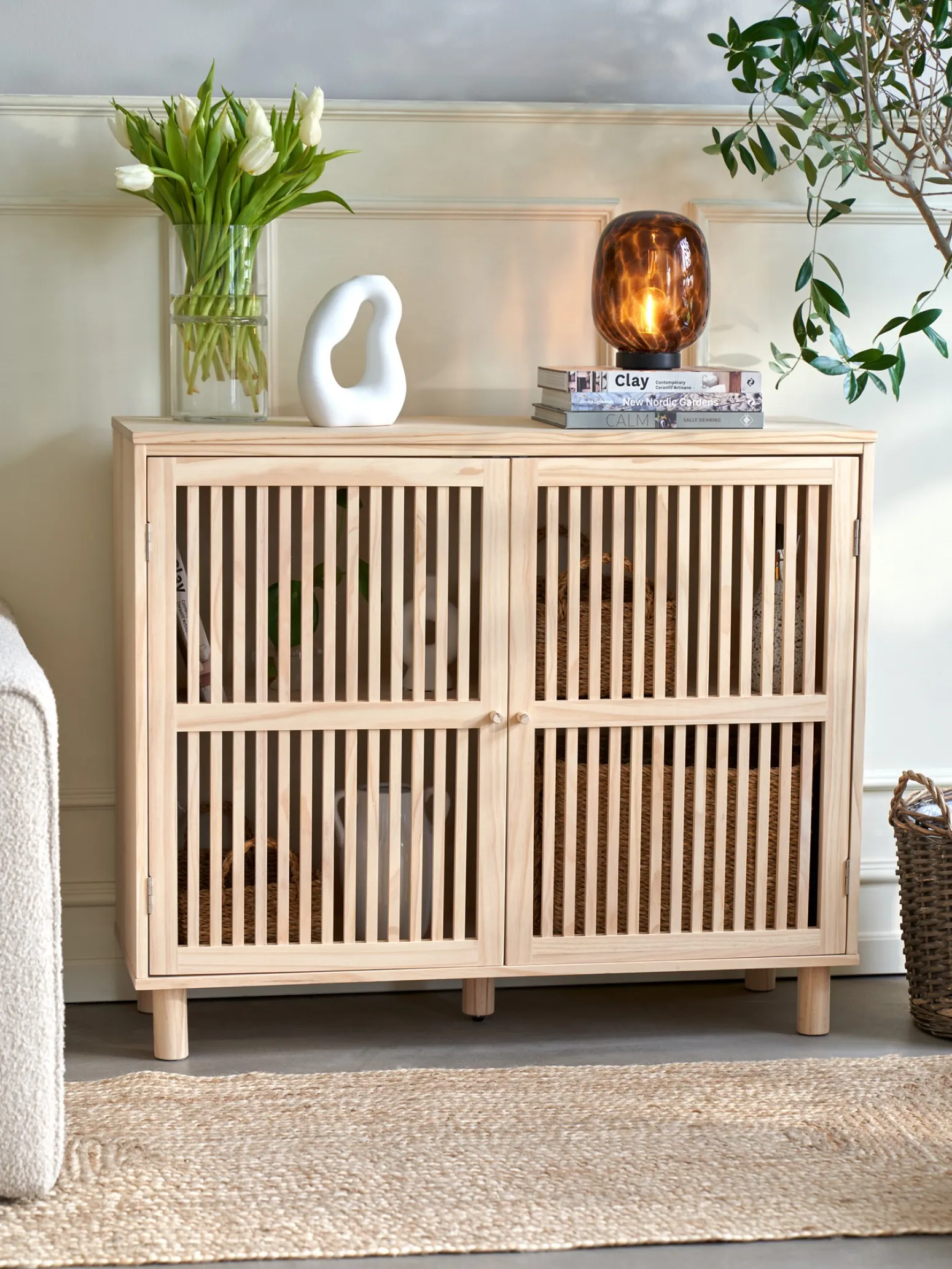 Der Schrank der Schwestern besteht aus 100 % FSC®-zertifiziertem und unbehandeltem Kiefernholz und misst 95 x 35 x 80 cm.„Das sieht ja absolut wundervoll aus“, ruft Clara, als sie den neuen Schrank entdeckt, den Anna im Wohnzimmer aufgestellt hat. Im Inneren hat sie das Weihnachtsgeschirr der Schwestern aufbewahrt und es sicher verstaut, bis die Feiertage kommen.„In der Tat! Das Holz bringt eine natürliche Wärme in den Raum und die Türen verleihen ihm eine schöne Eleganz“, lächelt Anna.